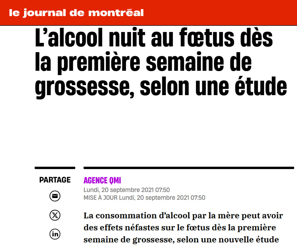 «Nos résultats démontrent qu’une forte exposition prénatale à l’alcool sur une courte période altère les futurs profils de méthylation de l’ADN du cerveau du jeune embryon et augmente le nombre de défauts morphologiques, et ce, dès la première semaine de grossesse», a indiqué Serge McGraw, chercheur au CHU Sainte-Justine et professeur au département d'obstétrique-gynécologie de l’Université de Montréal.